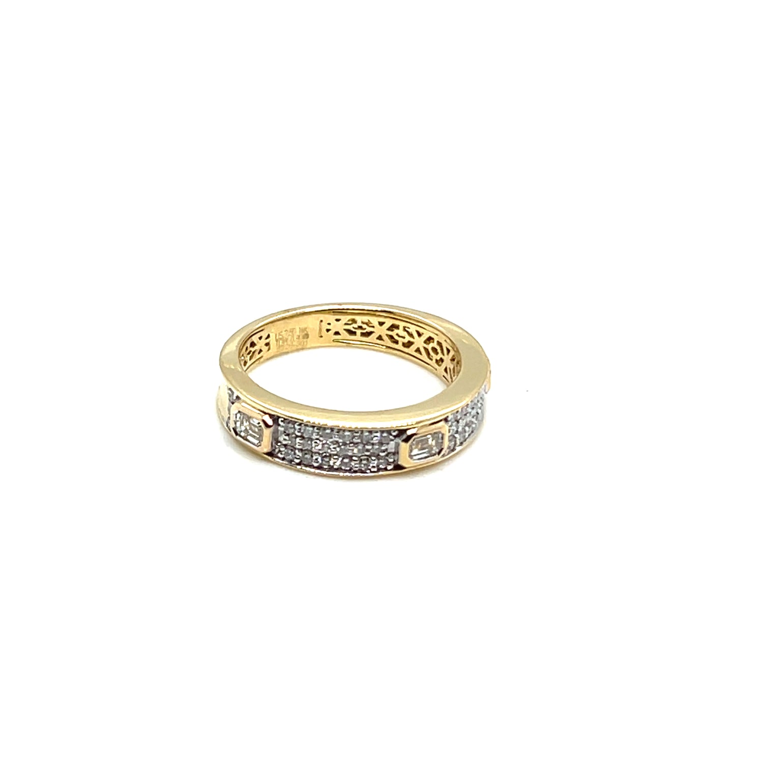 14Kt Yellow Gold Diamond Fashion Band with 3 Emerald Cut Diamonds weighing .59 Cttw and Brilliant Round Diamonds weighing .32 Cttw. The Ring is a size 7.5 and weighs 4.61 Grams.