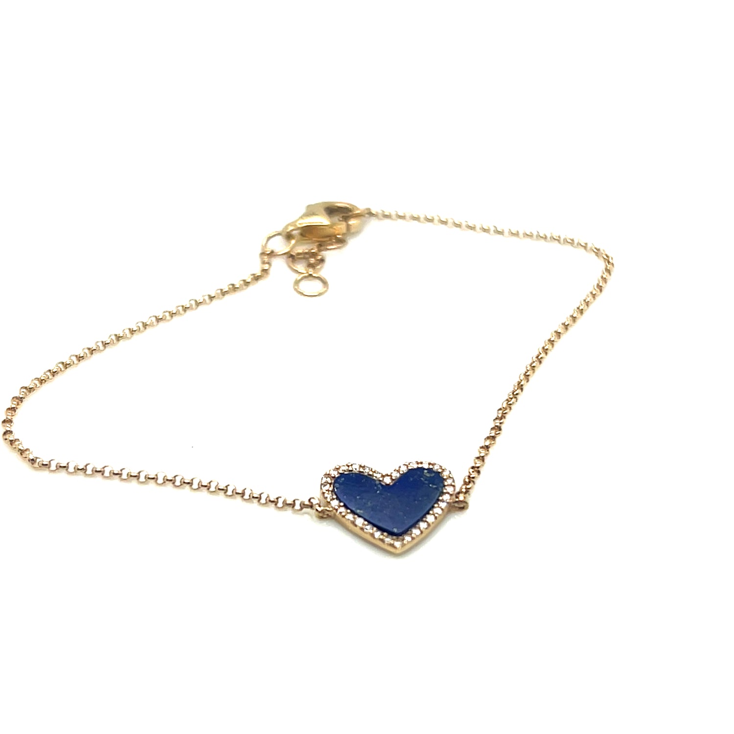 14Kt Yellow Gold Lapis and Diamond Heart Bracelet with 32 Brilliant Round Diamonds weighing .08 Cttw and 1 Lapis heart weighing .58 Cts. The Bracelet has adjustable Links and weighs 1.50 Grams.